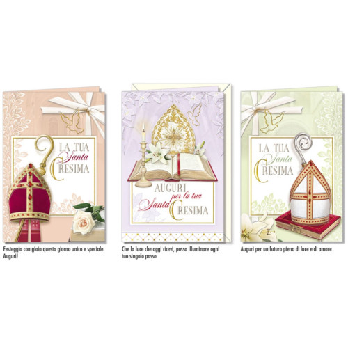 Biglietti fotografici in oro per la Cresima. Ogni biglietto presenta un motivo religioso stampato a colori all'interno. Confezionati in buste bianche di alta qualità